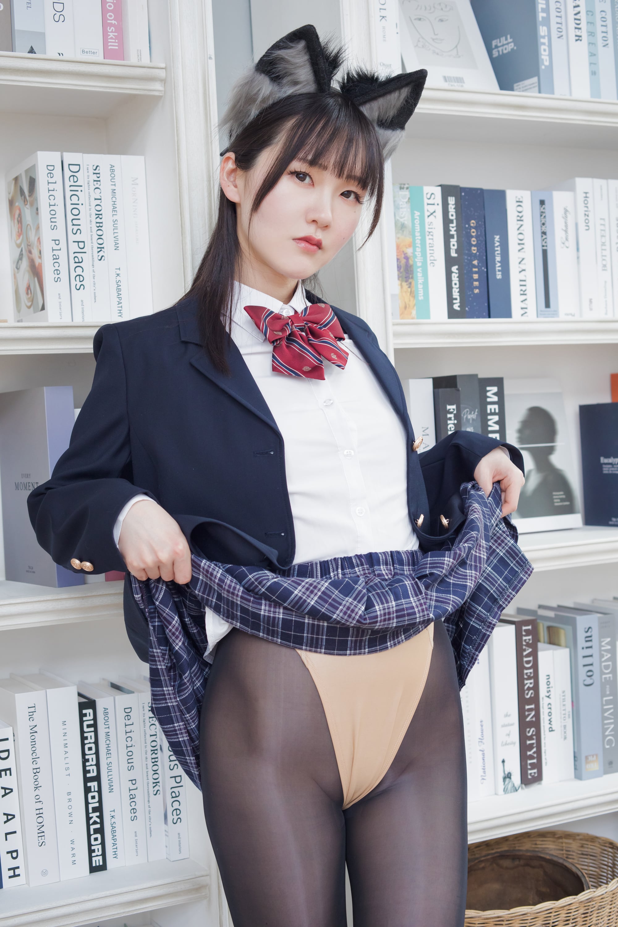 収録衣装:ケモ耳ブレザー制服(ベージュ競泳)×光沢タイツ