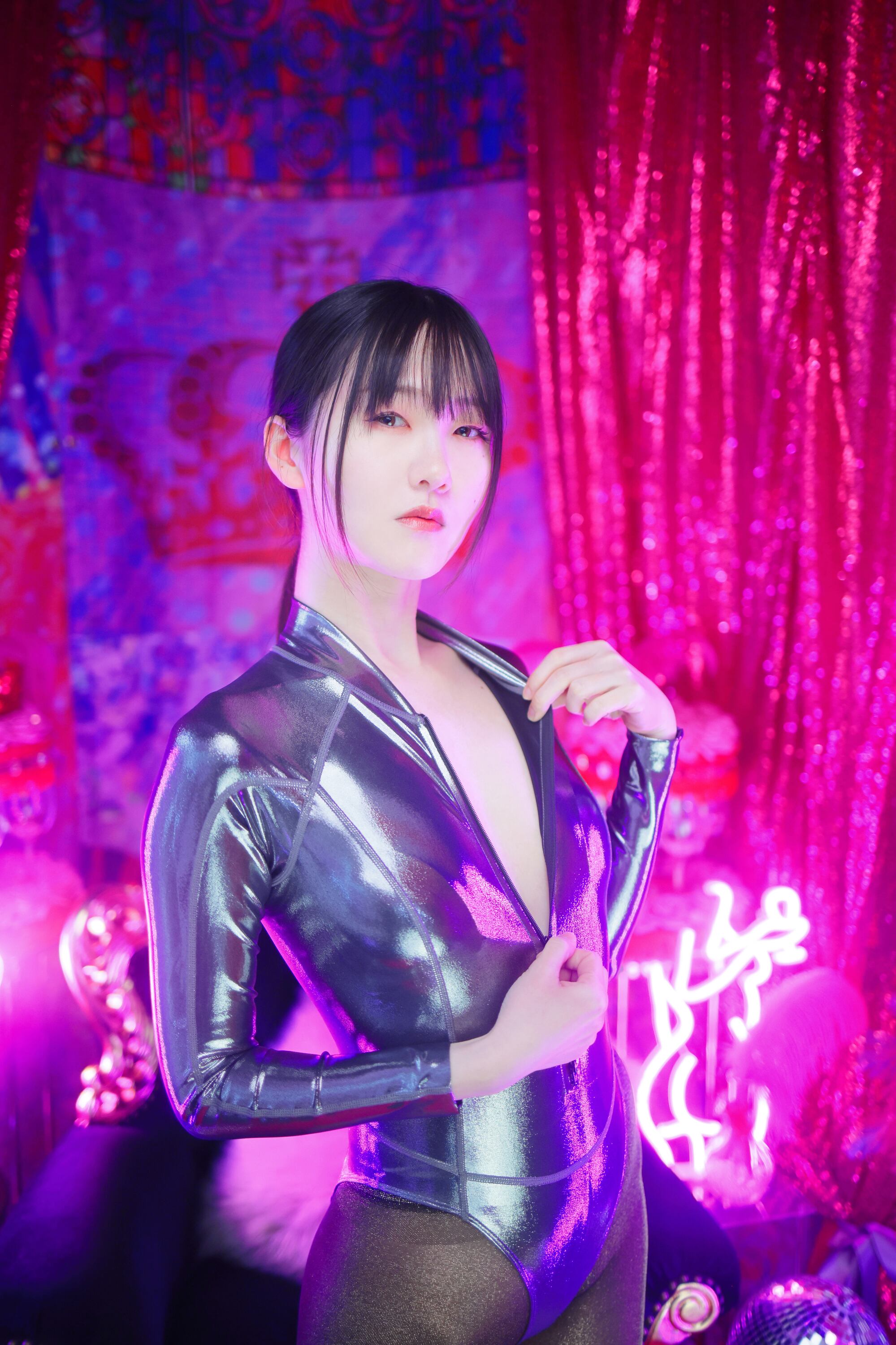 収録衣装:メタリックレオタード×ラメタイツ、黒マット競泳×タイツ×ロンググローブ